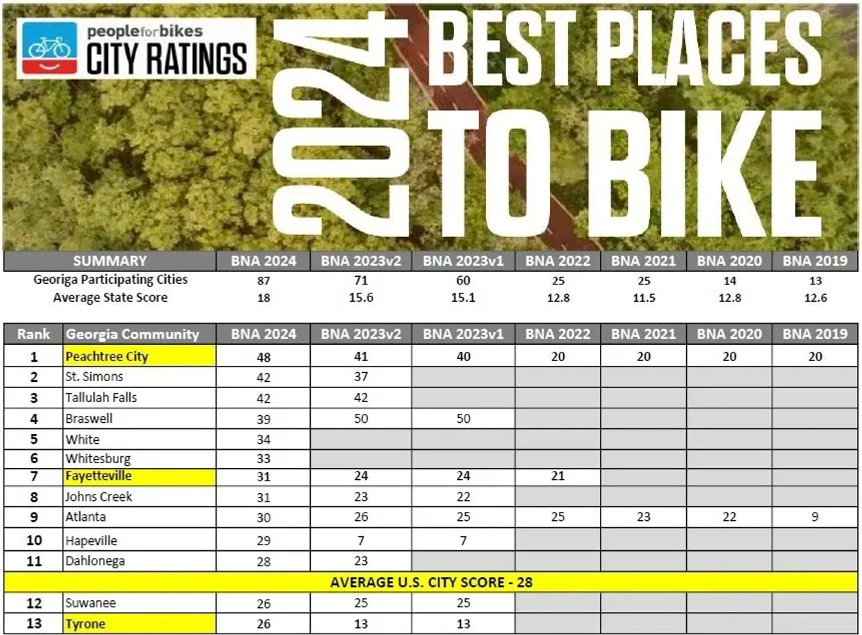 Peachtree City was also recognized among the United States 2024's Most Improved Cities for Biking, increasing by 28 points since 2020.